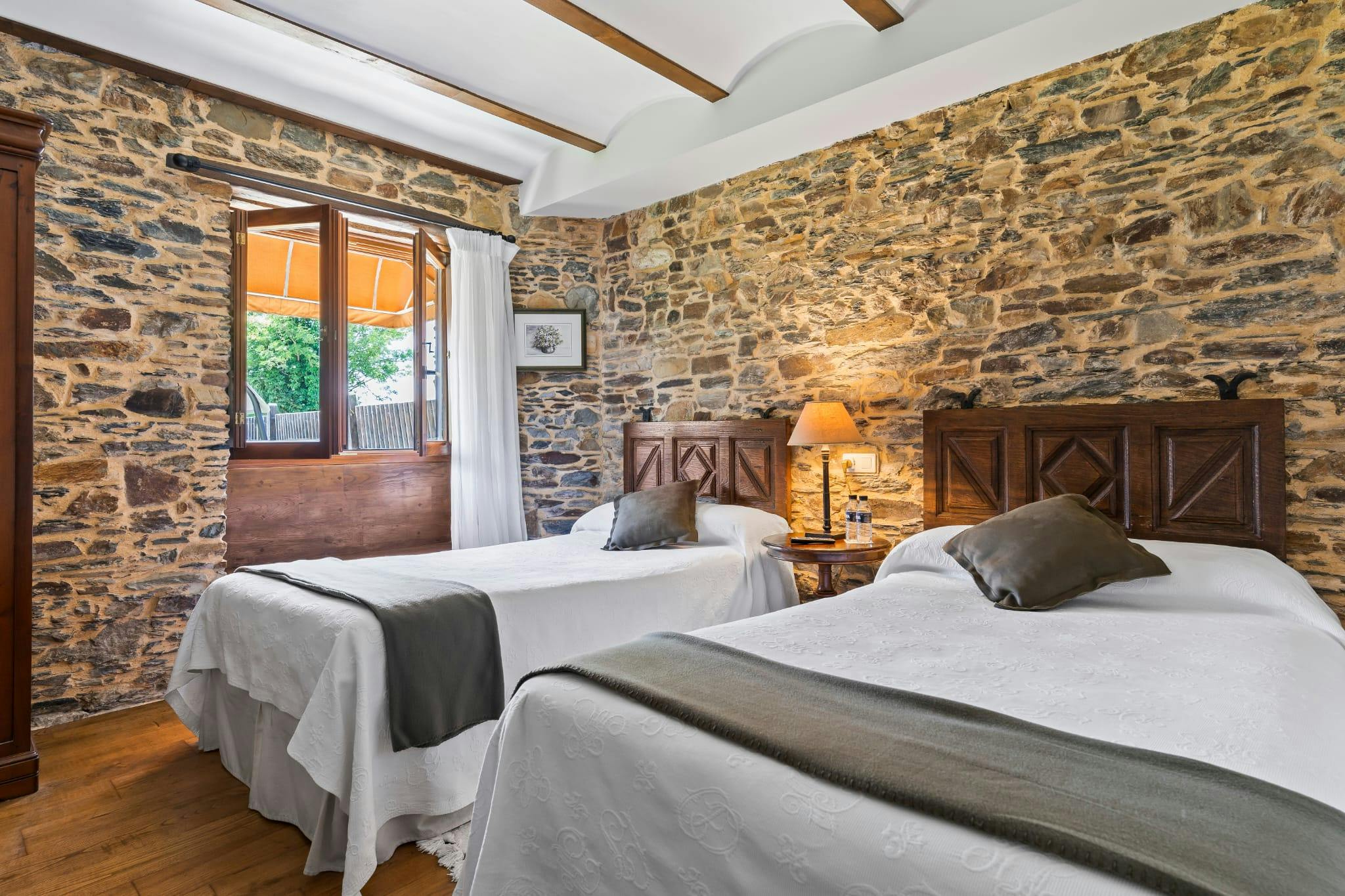 Habitación de dos camas individuales con baño privado y jardín. Disfruta de una experiencia tranquila con comodidades todo incluido y vistas al entorno natural.